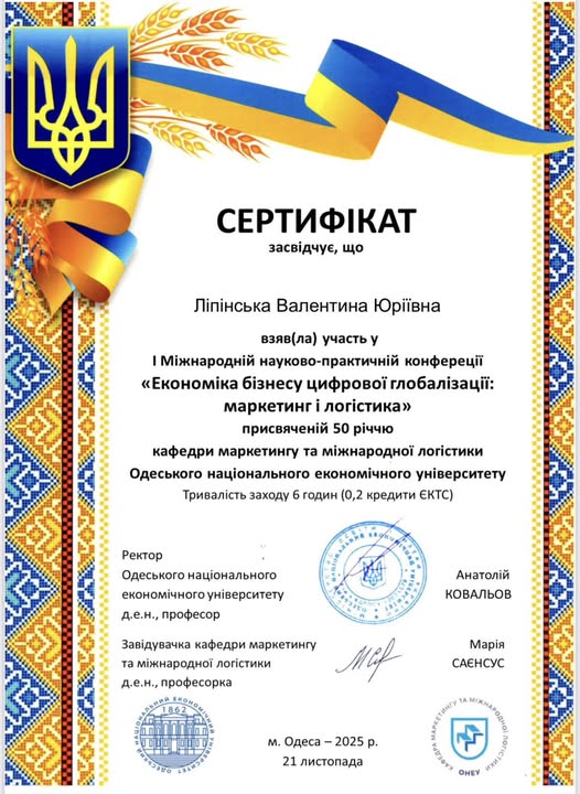 21 листопада 2025 року викладач економічних дисциплін Валентина ЛІПІНСЬКА взяла участь у І Міжнародній науково-практичній конференції «Економіка бізнесу цифрової глобалізації: маркетинг і логістика»... Детальніше