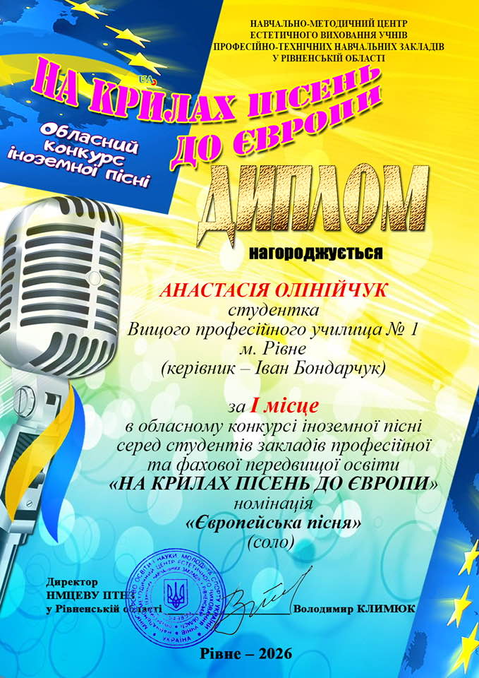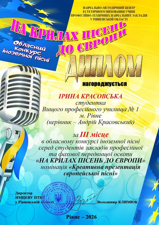 Щиро вітаємо Ірину Красовську, здобувачку освіти Вищого професійного училища №1 м. Рівне, із здобуттям ІІІ місця в обласному конкурсі іноземної пісні «На крилах пісень до Європи»... Детальніше
